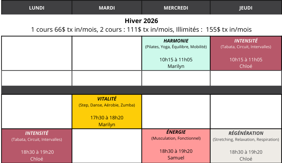 Voir l'offre de coursHoraire hiver 2026